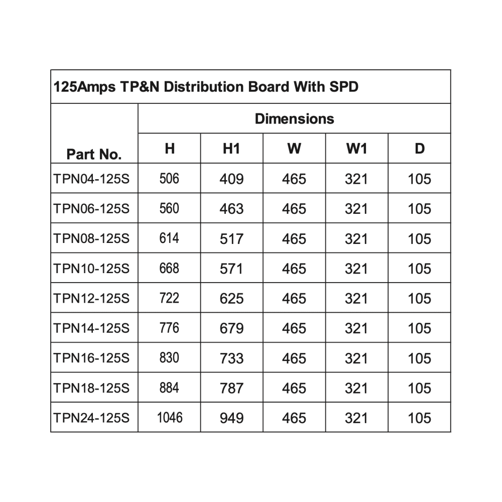 - Dimensions: H: 560mm, H1: 463mm, W: 465mm, W1: 321mm, D: 105mm (The images show TPN04-125S)