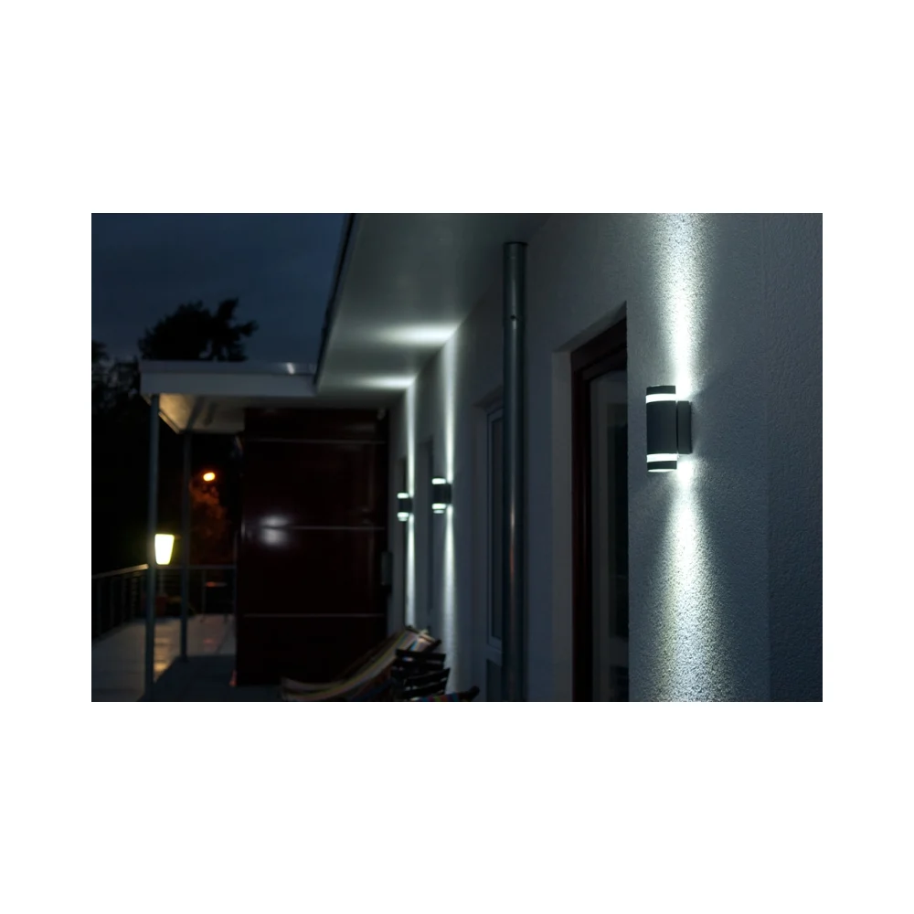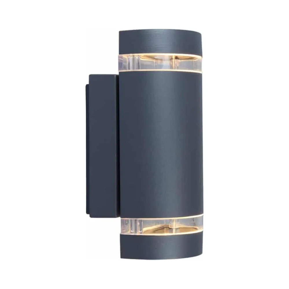 Introducing the Lutec Wall Light Focus2, a dark grey, round-shaped wall light featuring a sleek design with two light retrofit GU10 bulbs. Crafted from premium stainless steel, this fixture showcases a soft and shiny appearance that enhances any outdoor space.