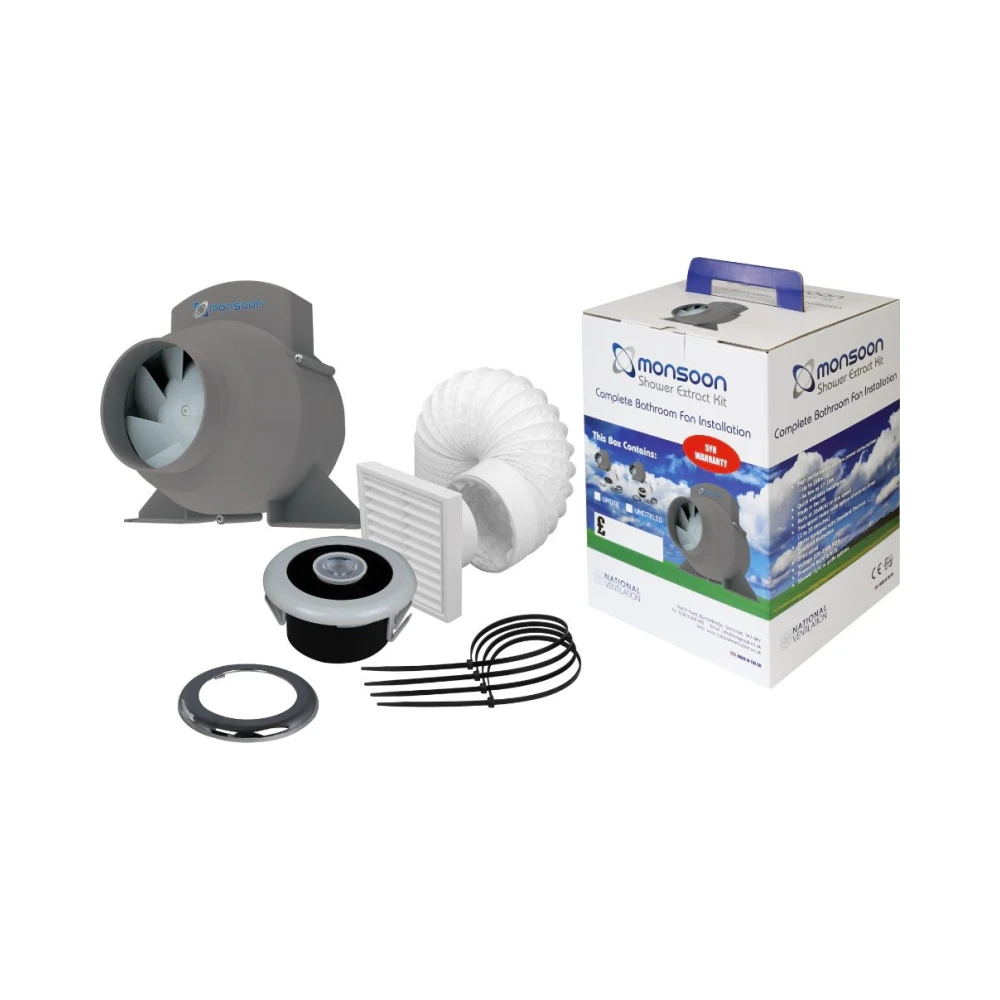 - Complete all-in-one shower extract kit with integrated cool white LED shower light