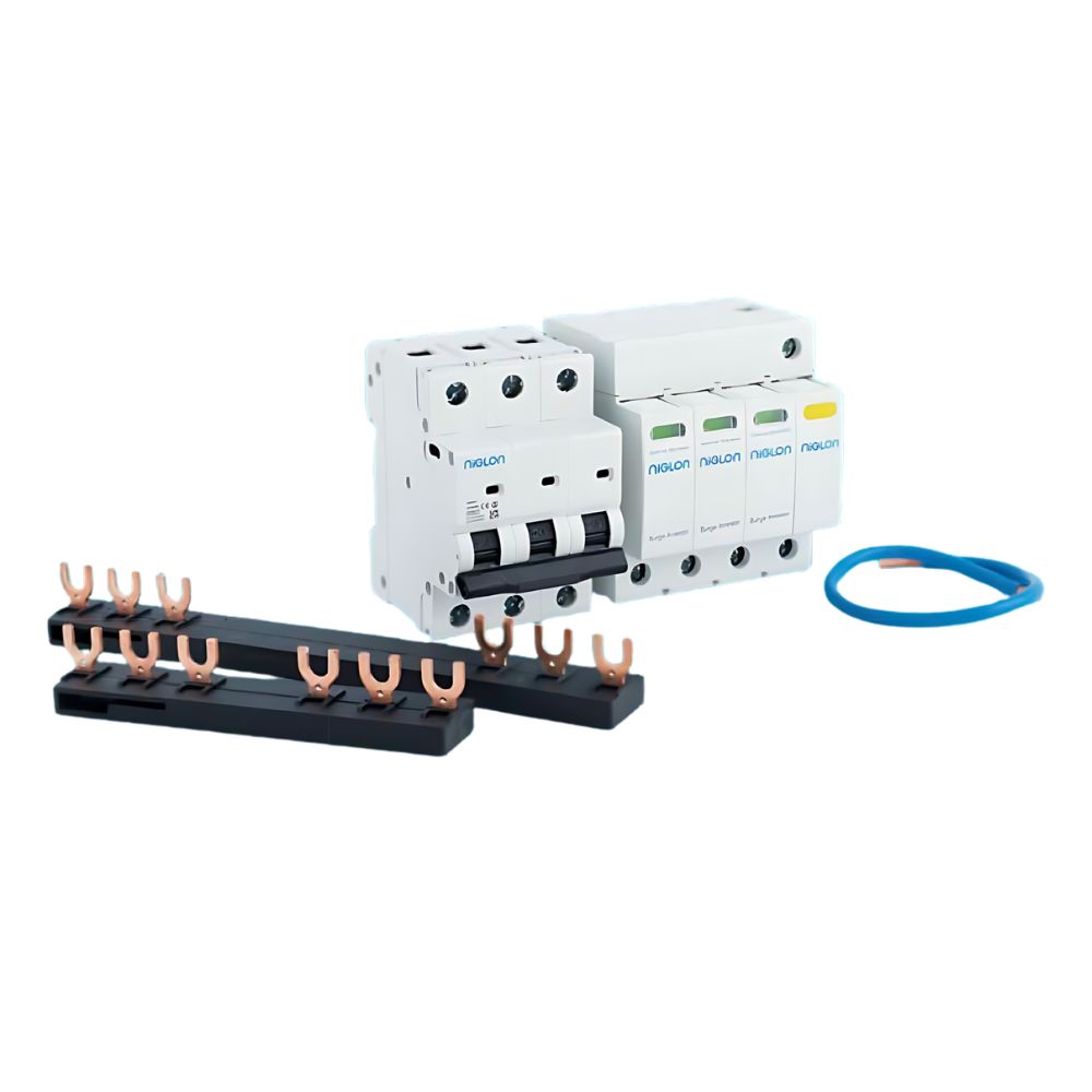 Niglon NTA2-415 Protego 3 Phase Surge Protection Kit with 40kA protection and fast response times. Supplied complete with 32A 10kA B curve MCB, busbars, neutral cable and earth link for quick, compliant installation in Protego boards.