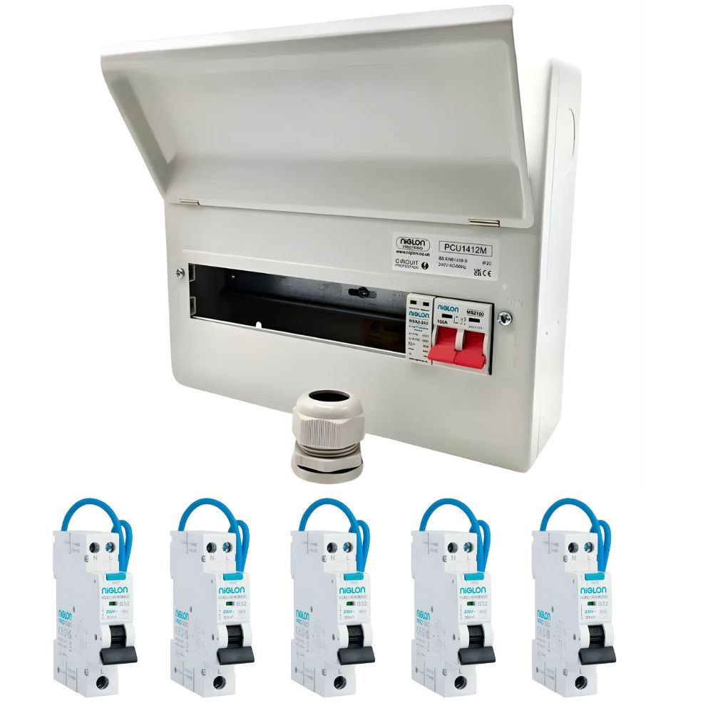 The Niglon PCU1008M SPD consumer unit kit is a compact, installer-ready solution supplied with 5 bi-directional Type A RCBOs (6–40A, B Curve), a 100A twin screw main switch, and a direct busbar Type 2 SPD. Designed for fast installation and full 18th Edition compliance, this kit provides reliable circuit and surge protection in one complete package.