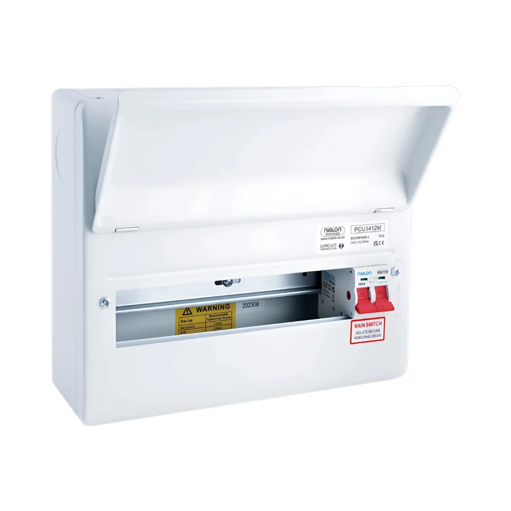 The Niglon PCU1412M is a right-hand incomer 12-way metal consumer unit with 14 modules total and a 100A twin-screw double pole isolator. Built from powder-coated steel, it’s IP20-rated, BS 7671 compliant, and SPD-ready—ideal for larger domestic electrical installations with future expansion in mind.