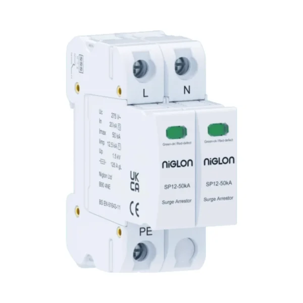 The Niglon SP12S-1PN 50kA Type 1+2 Surge Protection Device (SPD) is a compact and high-performance solution designed to protect electrical installations from transient overvoltages and lightning strikes. This two-module SPD is suitable for use in incoming distribution panels, particularly in buildings with lightning protection systems or high-risk environments.