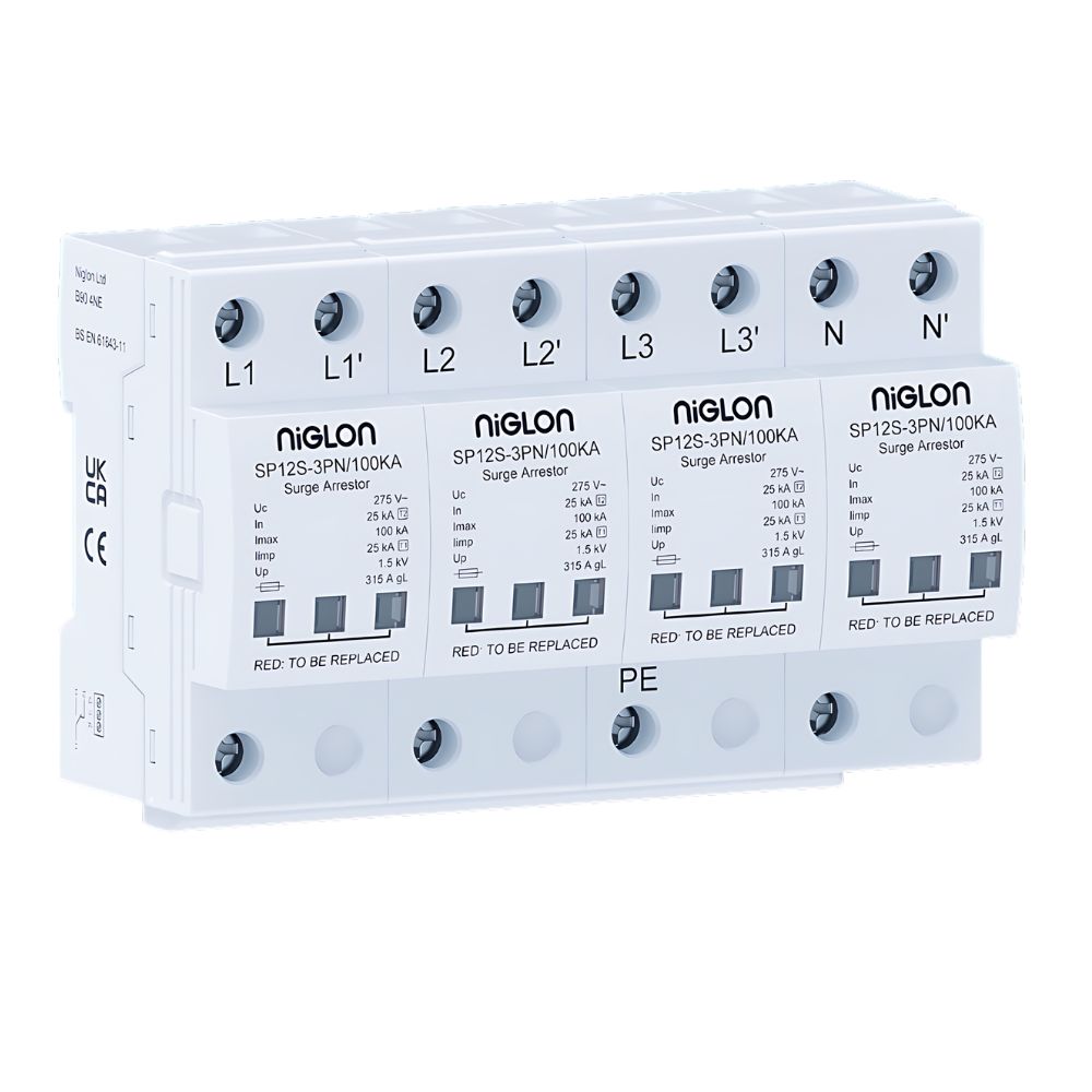 Niglon SP12S-3PN/100KA Type 1+2 SPD with 100kA discharge capacity. Designed for three phase TN-S systems, this 3P+N surge protection device protects against lightning and transient surges, ideal for incoming distribution boards in high-risk installations.