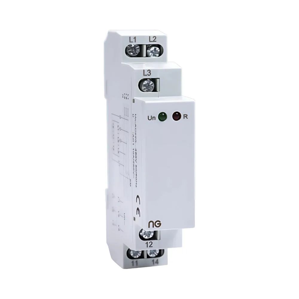 Compact DIN rail phase failure relay for 110–240V single-phase systems. Detects high or low voltage, has LED indicators, adjustable delay, and a 10A contact for switching loads safely.