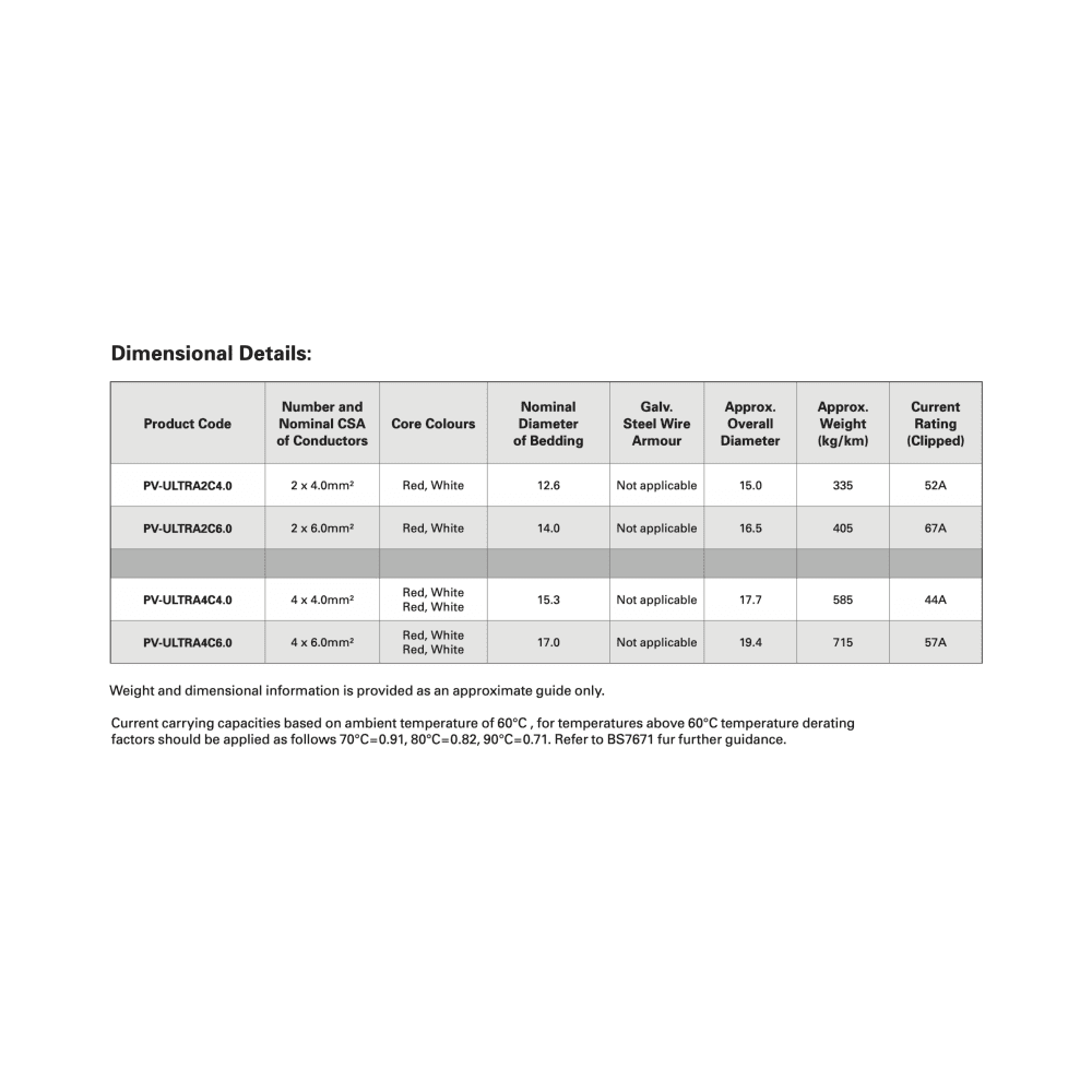 • Current carrying capacities based on ambient temperature of 60°C , for temperatures above 60°C temperature derating factors should be applied as follows 70°C=0.91, 80°C=0.82, 90°C=0.71. Refer to BS7671 fur further guidance.