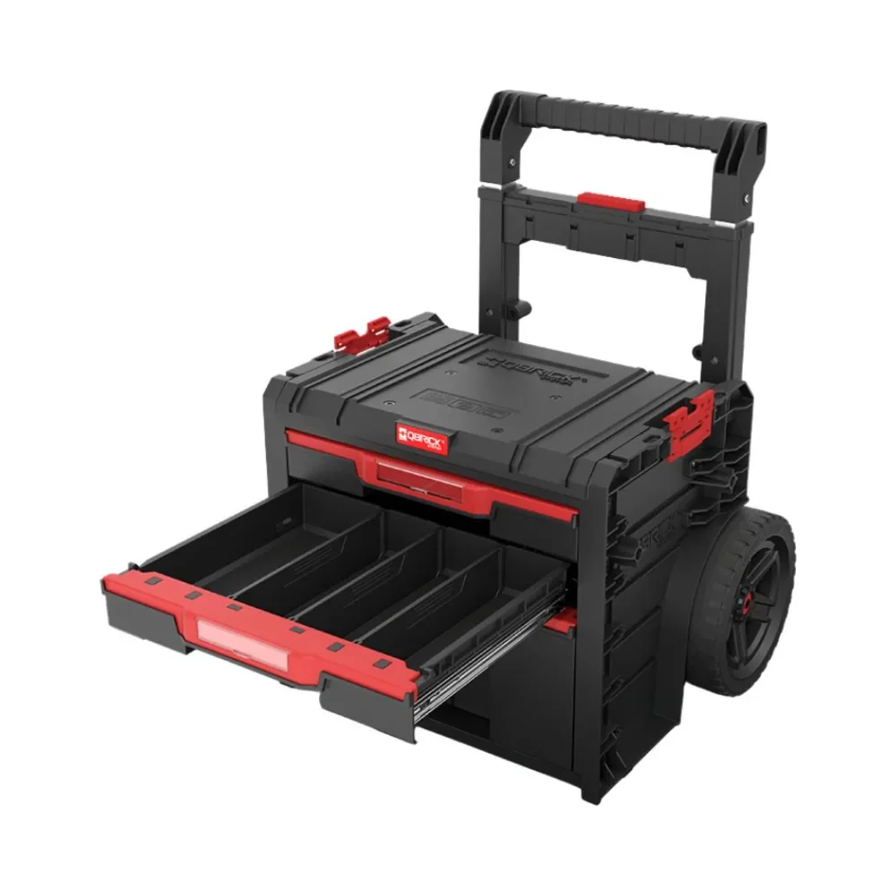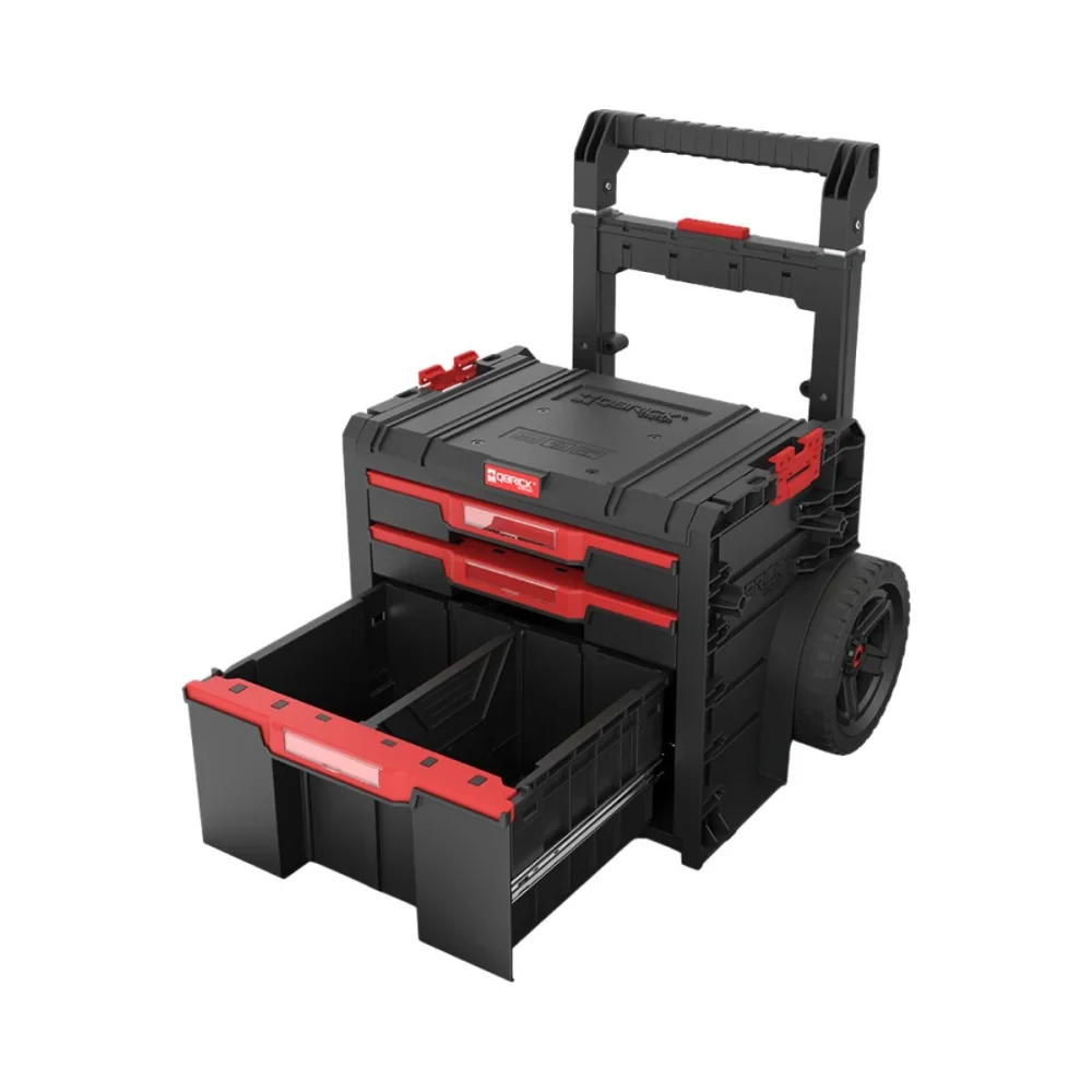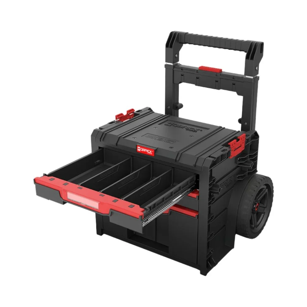 The Qbrick System PRO Cart 2.0 Plus Drawer 3 is a versatile, triple-drawer mobile tool storage solution featuring 2 low drawers with fixed compartments and 1 large drawer with adjustable storage. It includes 9-inch rubber wheels, a telescopic handle, and a waterproof build—making it perfect for jobsite use, transport, and professional tool organisation.