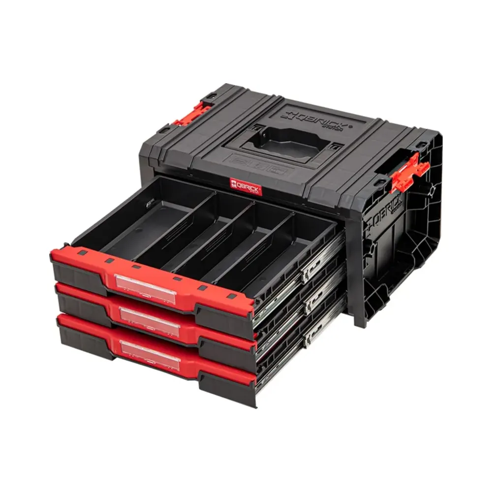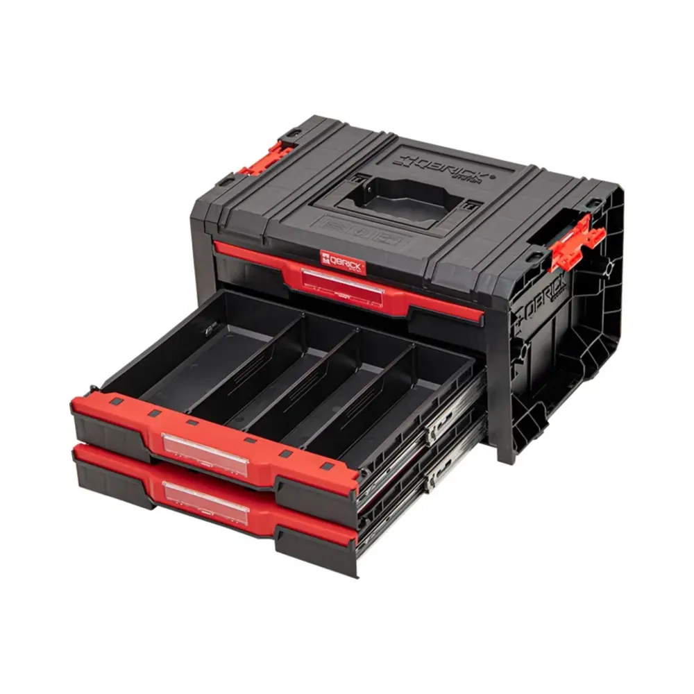 The Qbrick System PRO Drawer 3 Toolbox Basic offers a practical solution for organising your workshop. This spacious toolbox features three pull-out drawers on metal slides, each equipped with a convenient button for easy access. The Basic version includes 9 adjustable dividers to help you keep tools and accessories neatly arranged.
