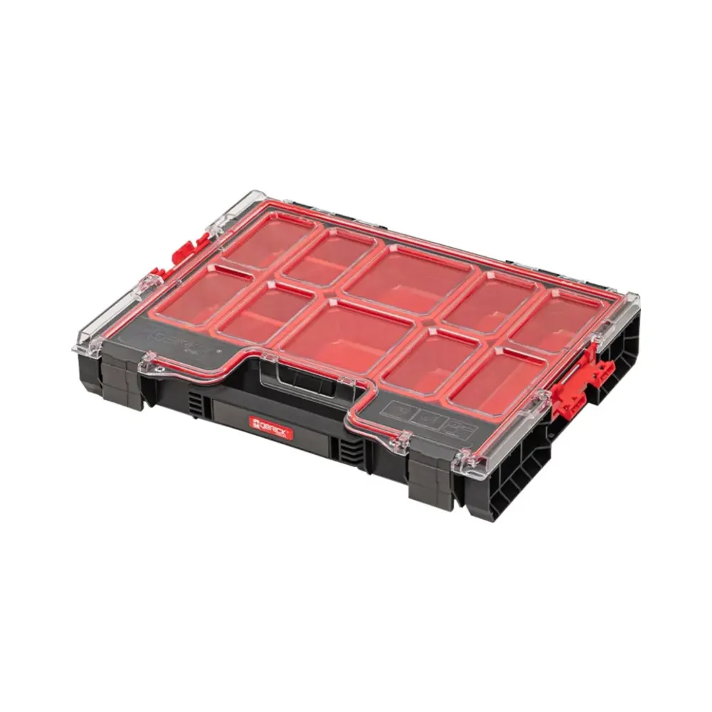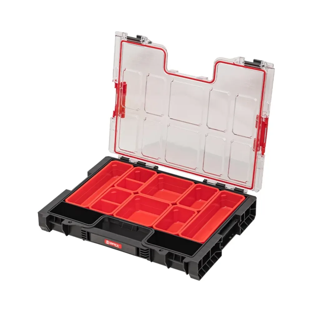 The Qbrick System PRO Organiser 200 offers a balance of functionality and durability. This medium-sized organizer features the patented Easy Access System, a gasket-sealed polycarbonate lid, and sturdy polyamide connectors. It comes with a comfortable handle and robust front fasteners. Depending on the version, it includes either 8 assorted buckets or multi-layer foam inserts for customisable tool storage.