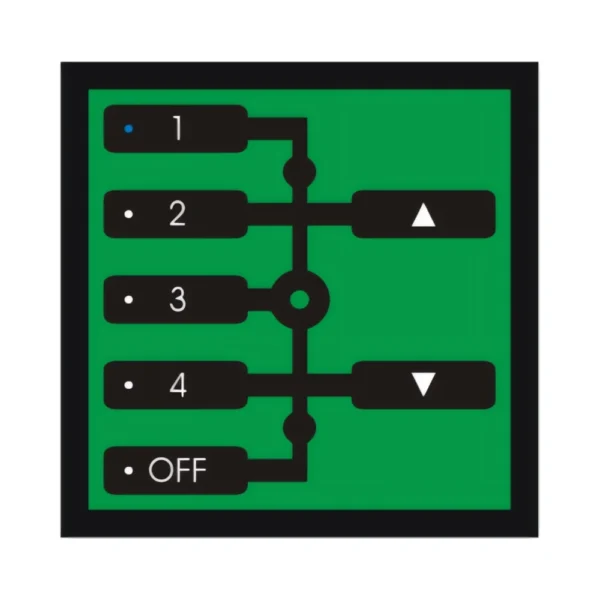 The WCM-070 push button control module comes preconfigured for selecting 4 scenes, off and master raise & lower. Each button is complete with a blue LED indicator and day-night etched buttons.