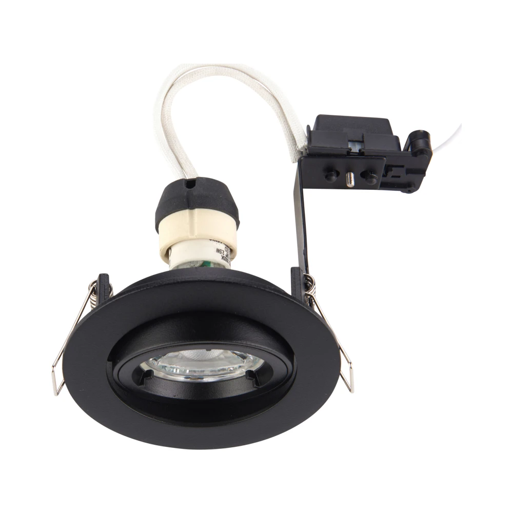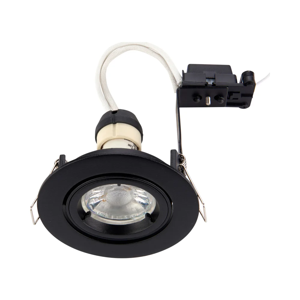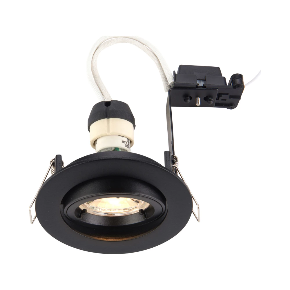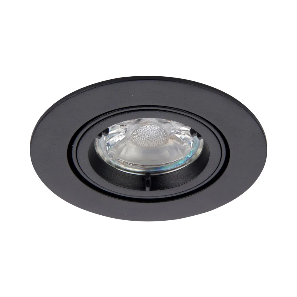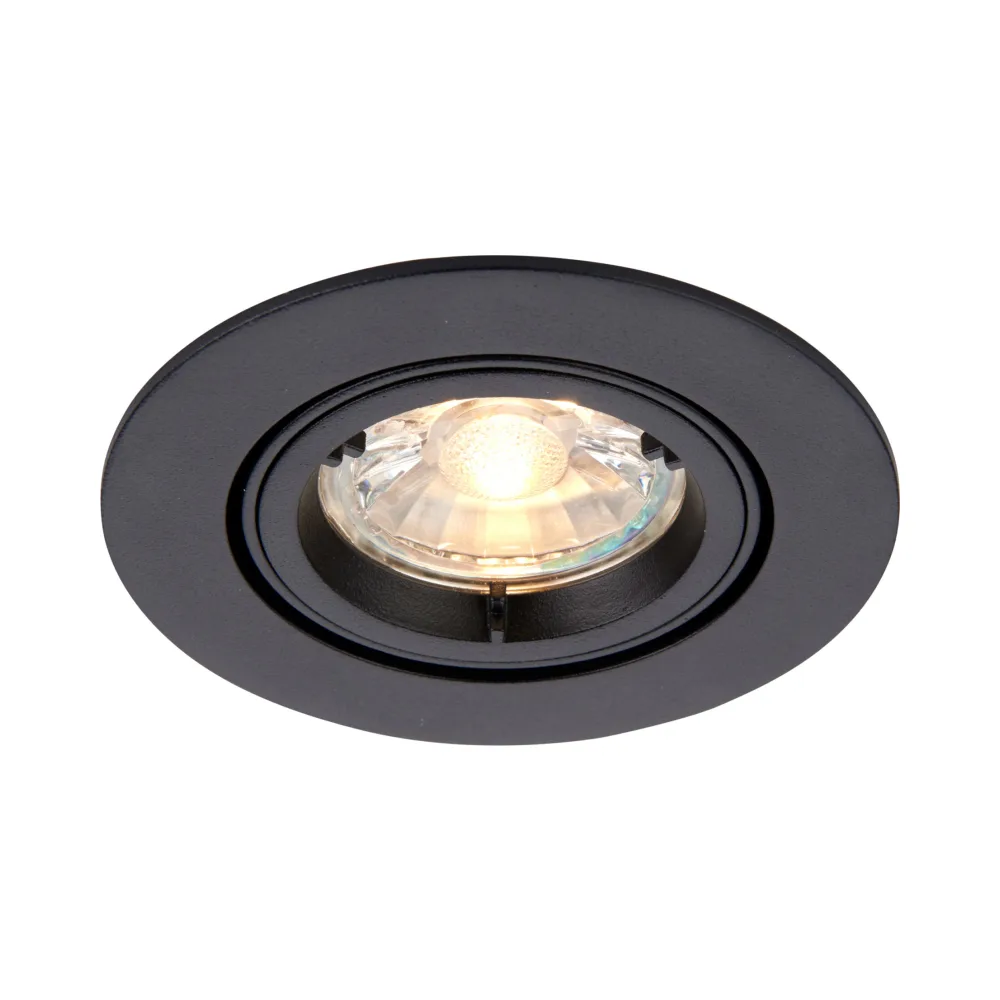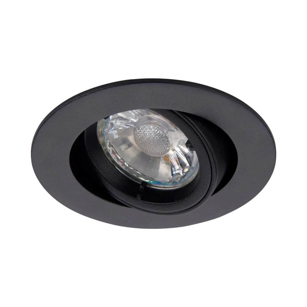 A mains voltage halogen downlight with a tilt mechanism for directional light, finished in matt black. Ideal for general, accent and display lighting. Other options available in the range.