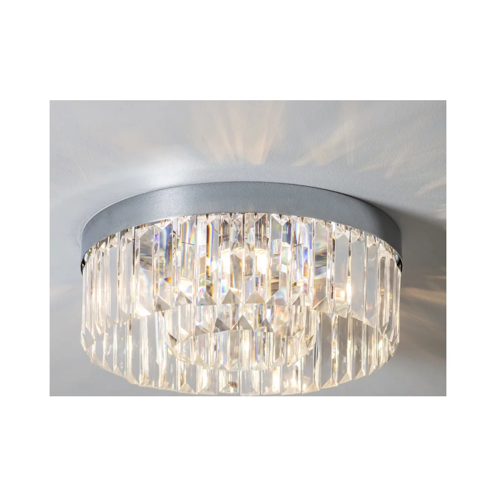 Stunning and chic, the Crystal ceiling light is the perfect choice for making a feature piece in any luxury bathroom. IP44 rated, ensuring protection against the intrusion of water & compatible with LED lamps, this fitting can be energy efficient as well as stylish.