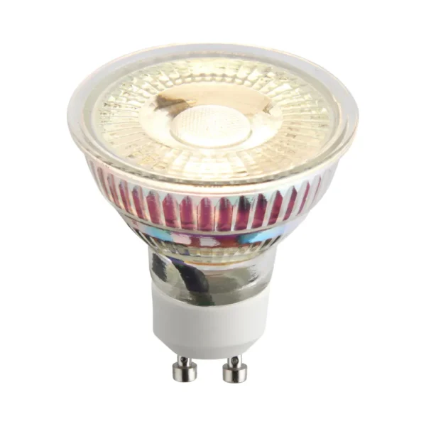 Energy-Efficient Warm White LED: The Saxby GU10 LED 5.5W lamp offers 3000K warm white light with a clear glass design, providing an efficient replacement for halogen bulbs.