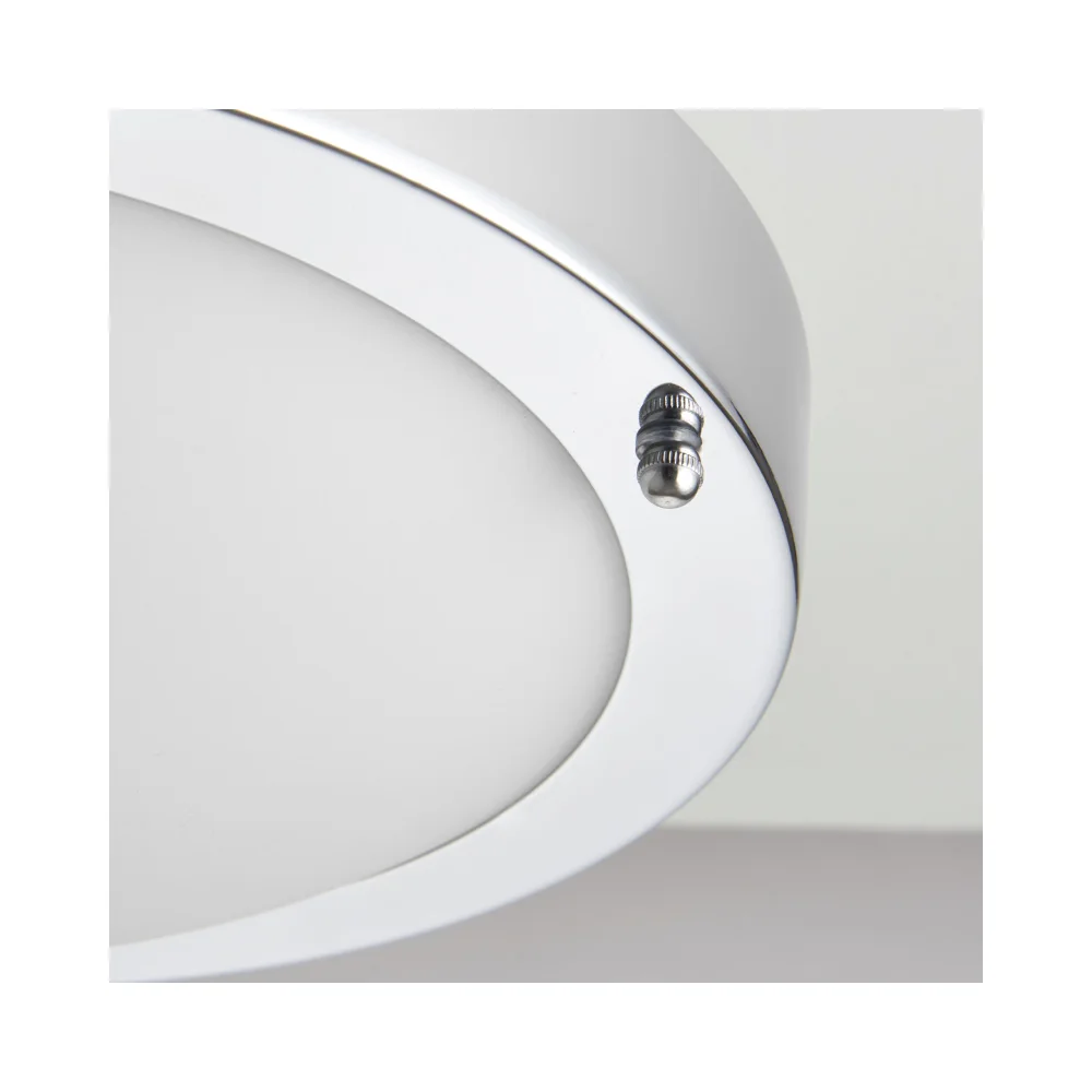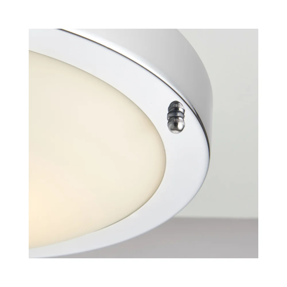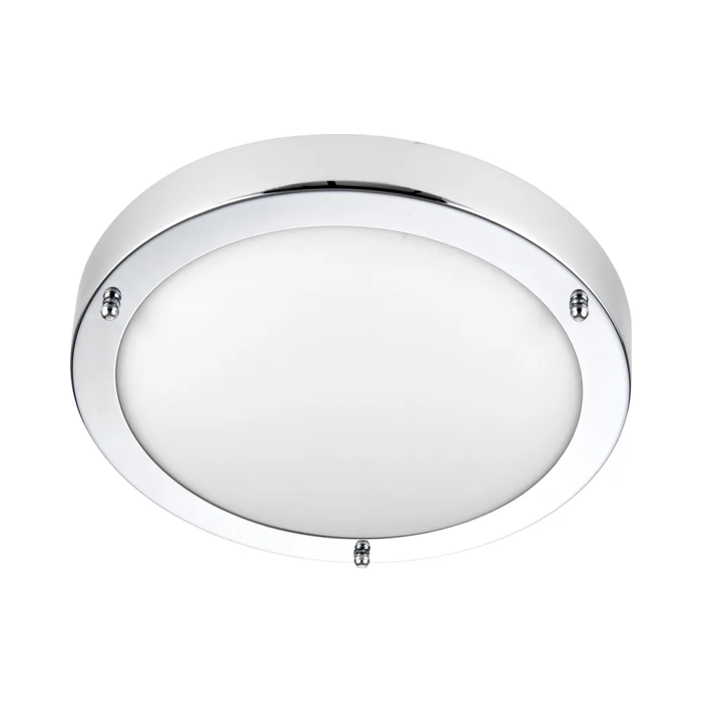 The popular Portico bathroom ceiling light features frosted glass and chrome finish. This fitting is dimmable, suitable for use with LED lamps and IP44 rated.