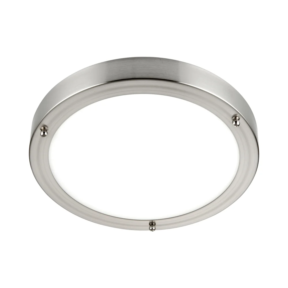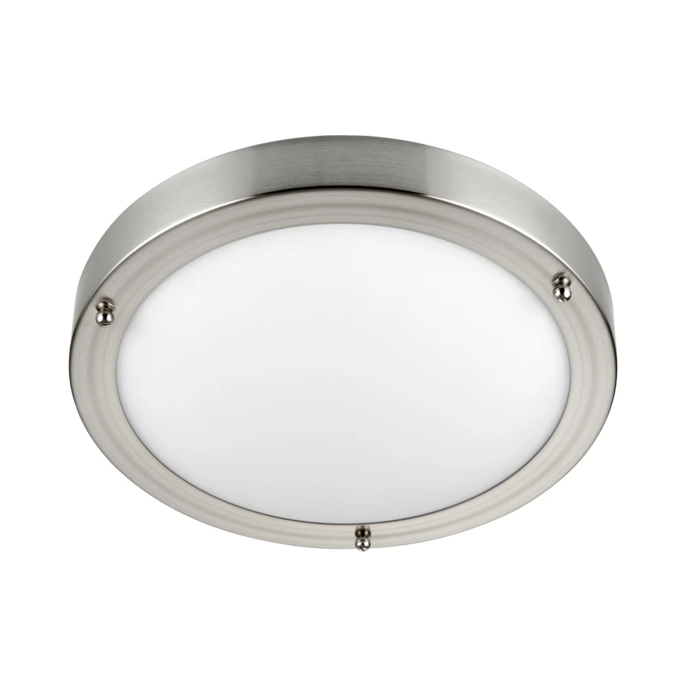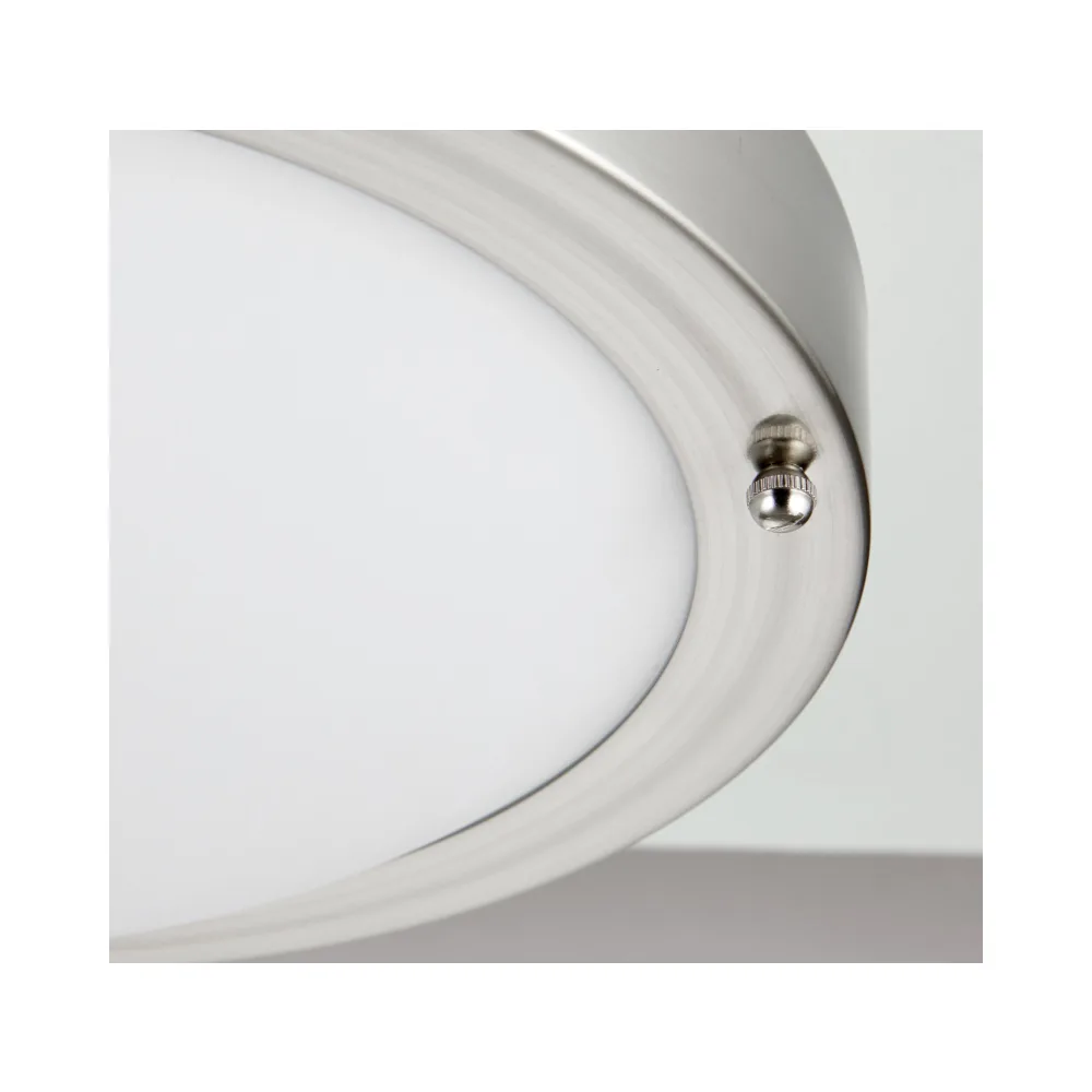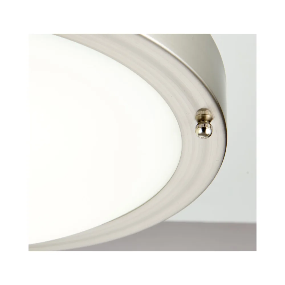 The popular Portico LED bathroom ceiling light features frosted glass and satin nickel finish. This fitting can also be wall mounted if preferred and comes complete with LED driver. IP44 rated ensuring protection against the intrusion of water.