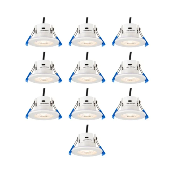 The ShieldECO CCT Fire Rated Downlight Pack of 10 is designed to meet the demands of modern residential and light commercial lighting projects where consistency and installation efficiency are essential. Each fitting is supplied with an integrated 5W LED module using SMD 2835 CCT technology, delivering 550 lumens with an efficiency of 110 lumens per watt. The CCT selector allows installers to choose between 3000K, 4000K or 6000K per fitting, providing flexibility across multiple rooms or applications. With a slim 3mm projection and a matt white finish, the downlights integrate discreetly into ceilings.