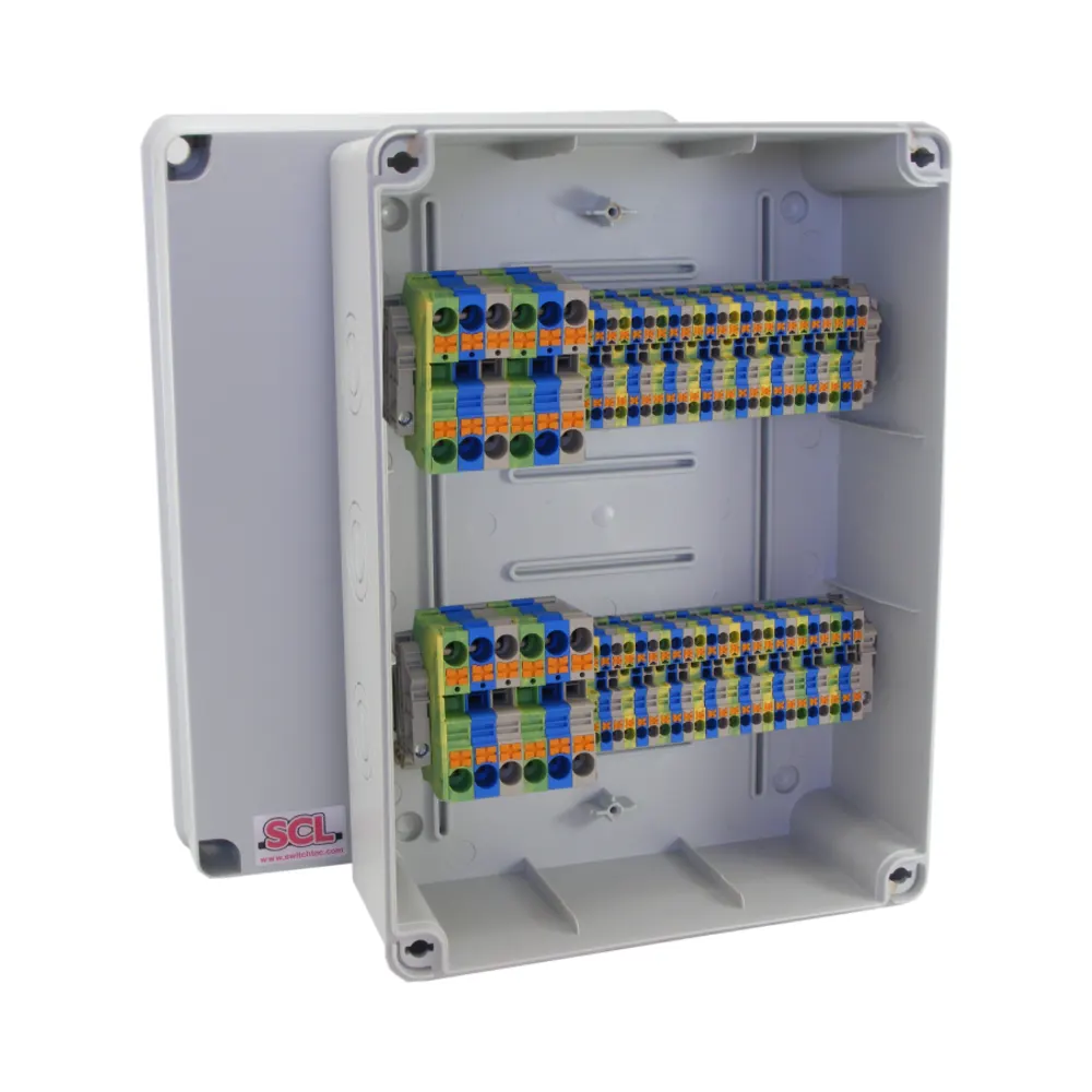 The Switchtec CURDP2 20 Way Consumer Unit Relocation Kit is designed for installations where a high number of outgoing circuits need to be extended or rerouted. Its 243 × 333 × 132mm enclosure houses 60 DIN push-in terminals, providing a clear and accessible wiring point when a consumer unit is moved or upgraded.
