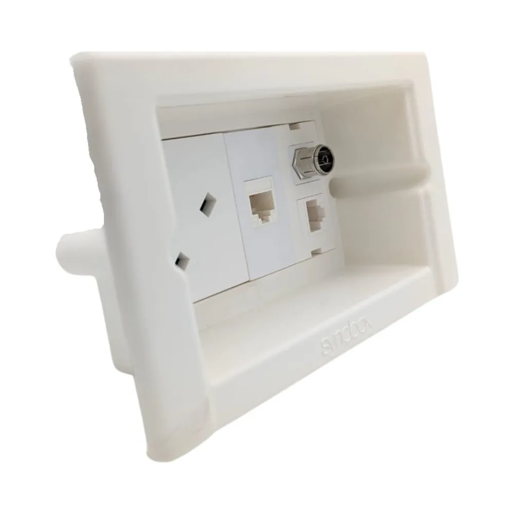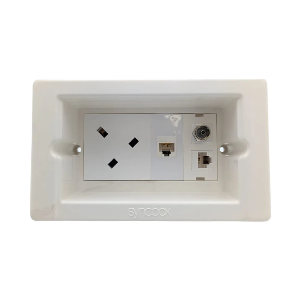 Syncbox Standard SB-004 revolutionises your home’s technical setup with its forward-thinking design. This flush, recessed socket system includes 2 x CAT6 data sockets, an F-type satellite socket, 3 voltage selector dividers, and a 13-amp angled power socket, ensuring you stay ahead of design trends and providing more versatility.