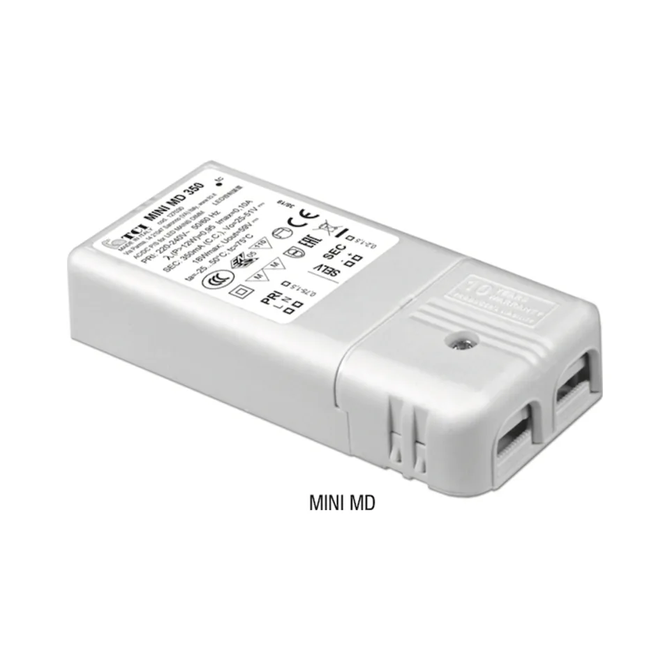The TCI 127030 Mini MD 350 LED Driver is a compact and high-performance solution for constant current LED systems. Designed for indoor use, this driver offers precise dimming capabilities, consistent 350mA output, and advanced safety features. Its small size and robust build make it ideal for applications with limited space, ensuring reliable and efficient performance for residential and professional lighting setups.