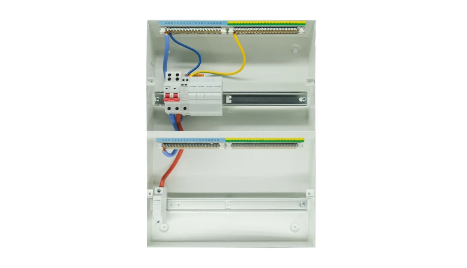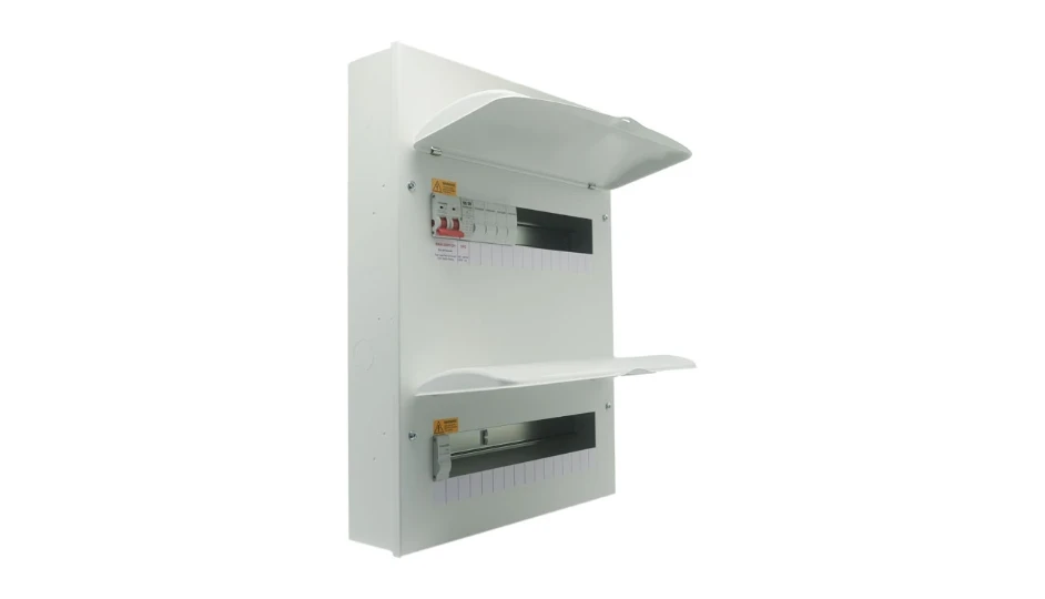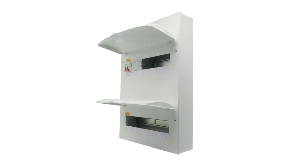 Housed in a robust surface-mounted dual-bank steel enclosure (2 × 16 modules) with a curved, lockable visor, the unit features large rectangular rear cable entries supplied with grommets, along with conduit entry points on the top, bottom and sides. A raised removable DIN rail allows cables to pass underneath, while the floating busbar with pre-fitted cover improves installation flexibility and safety. The enclosure is fully compliant with BS 7671:2018+A3:2024wiring regulations.
