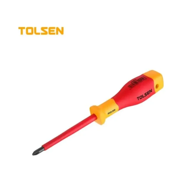 Tolsen V30402 VDE Phillips Screwdriver PH2 × 100mm is designed for professional electricians carrying out installation, commissioning and maintenance work on electrical systems. All Tolsen VDE screwdrivers are individually tested to EN60900 standards, making them suitable for safe use on live electrical circuits up to 1000V AC.