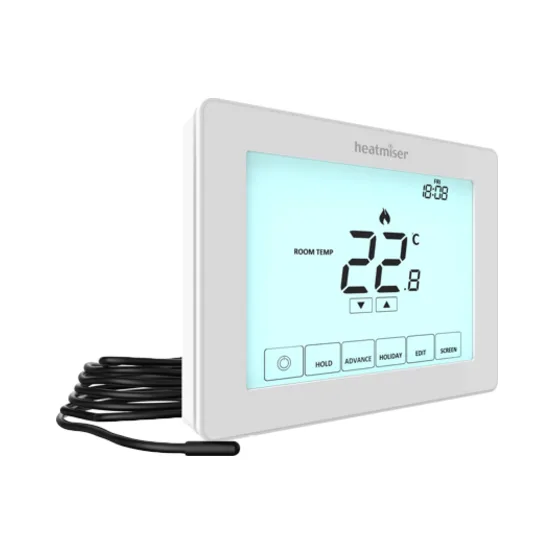 Heatmiser Touch-e is our touchscreen electric floor heating thermostat.