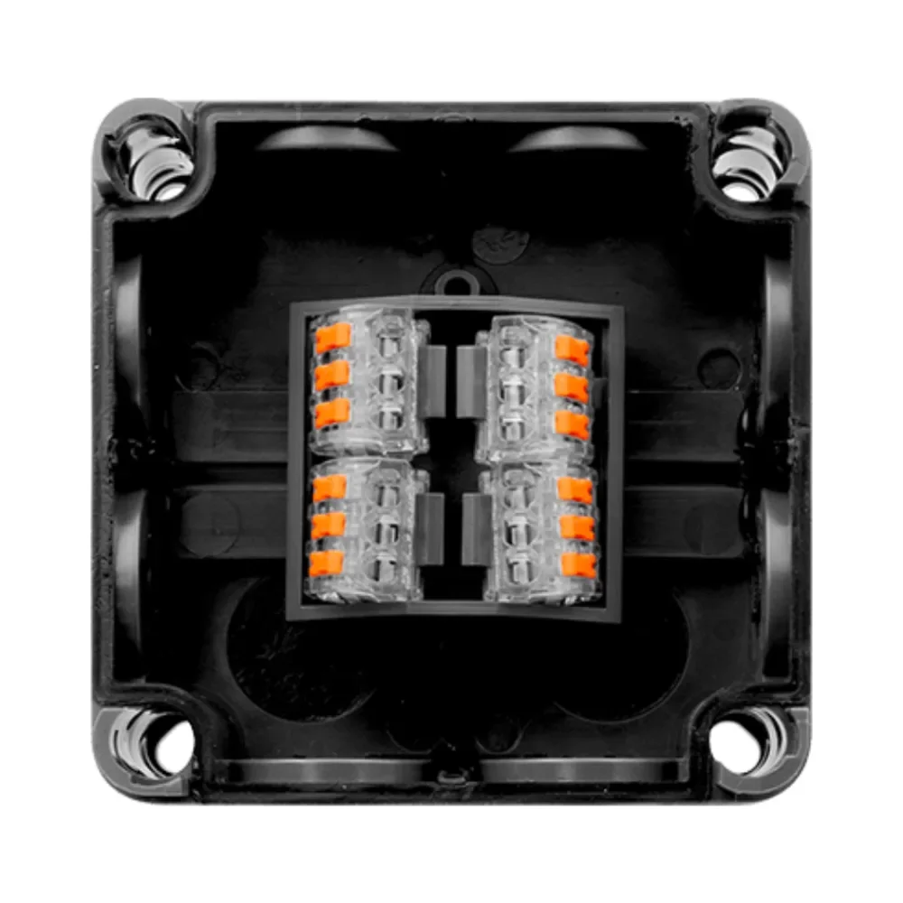This IP66-rated enclosure measures 85mm x 85mm x 52mm and comes equipped with 4 x 3-port lever connectors for efficient and secure wiring. Its sleek black finish (RAL 9017) complements modern installations, while the durable polycarbonate body and thermoplastic elastomer membranes ensure long-lasting protection against water, dust, and environmental factors.