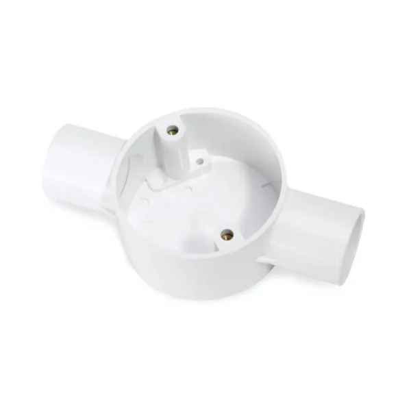 The Univolt CB 20/2 WH 20mm 2 Way Through Box is a compact circular junction box built specifically for 20mm conduit systems. Crafted from low-smoke PVC-LSF, it includes two conduit entries and integrated fixing lugs, making it a reliable and easy-to-install option for residential, commercial, and light industrial surface wiring. Fully compliant with BS 4607 and EN 60670 standards, it ensures neat and secure cable terminations in any visible installation.