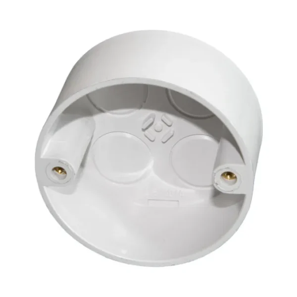 The Univolt LIB 20/4 WH 4-Hole Loop-In Box is a compact round junction box for loop-in wiring and lighting points. It has four side entry points and a rear inlet, with a durable white plastic body for wall or ceiling mounting.