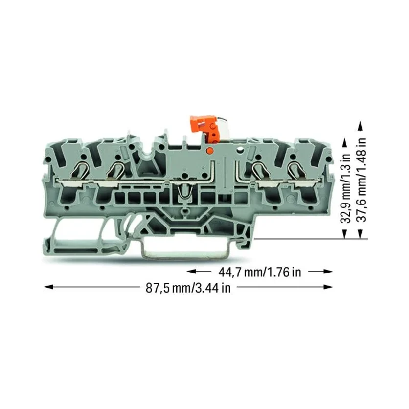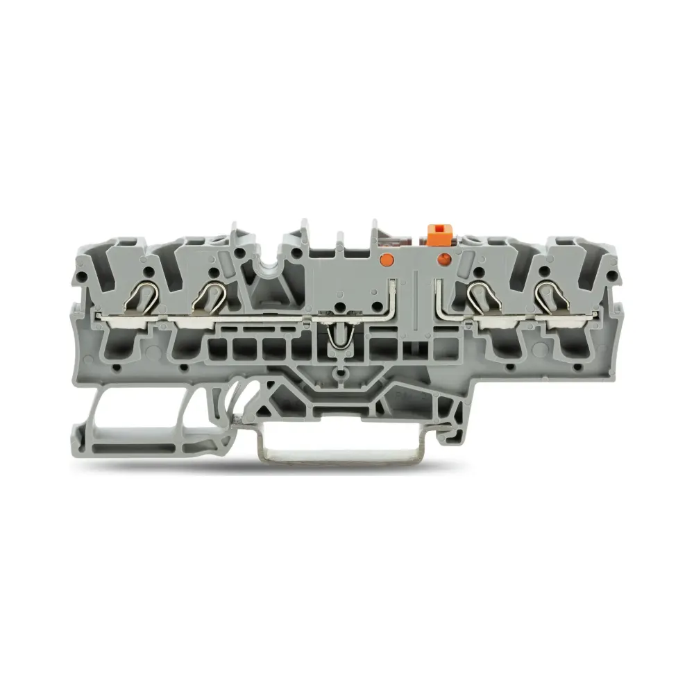 The WAGO 2002-1871 4-Conductor Disconnect/Test Terminal Block is a versatile and high-performing solution for electrical installations requiring both disconnect and testing capabilities. Equipped with an orange disconnect link and a test option, this terminal block simplifies maintenance and testing procedures. It also features Push-in CAGE CLAMP® technology, enabling tool-free wiring for faster and more secure connections.