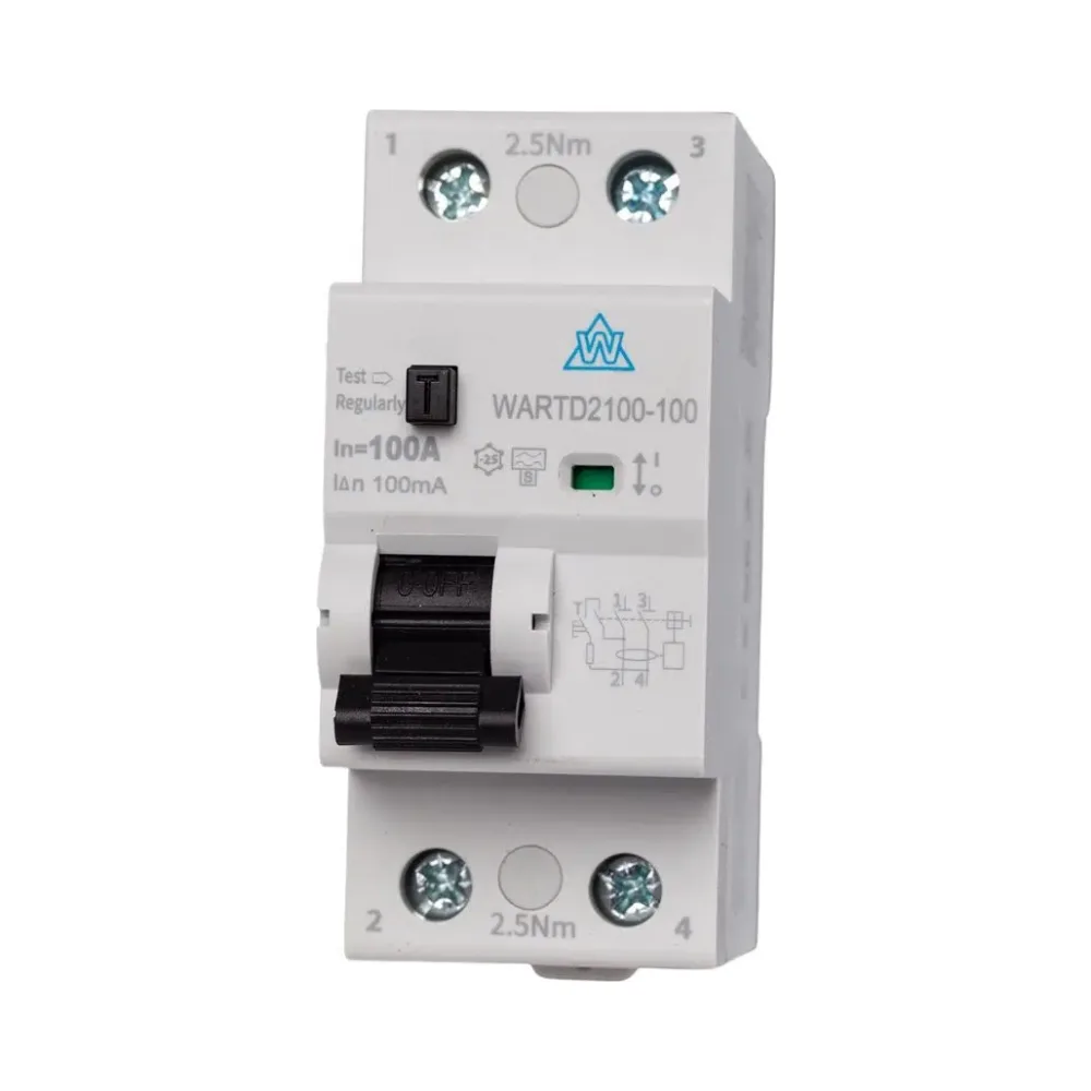 • 1 × WCED Type A Time Delay RCD – 2 pole, 100A, 100mA