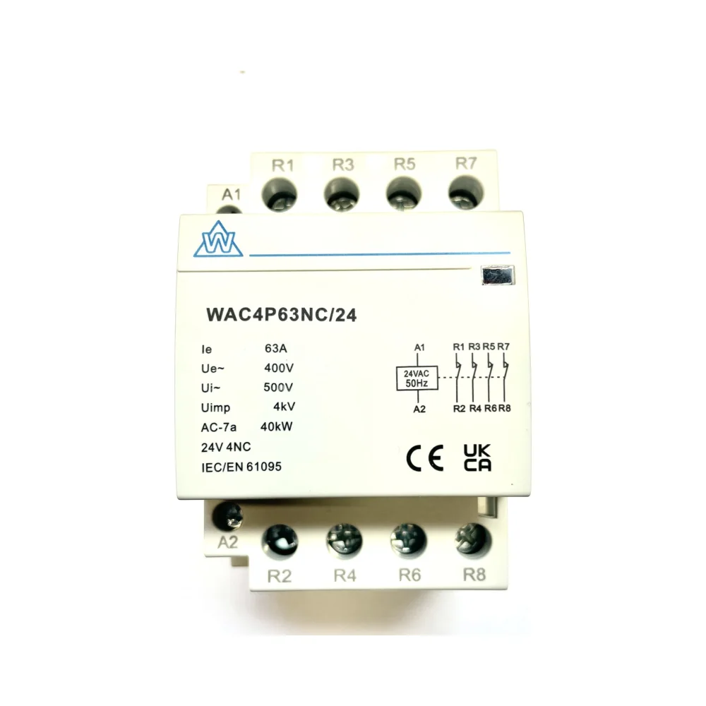 The WCED 4 Pole 63A 24V Normally Closed AC Modular Contactor offers a robust and reliable solution for managing high-capacity electrical circuits. Its compact design ensures efficient use of space within modular panels, consumer units, and enclosures, while its silent operation makes it perfect for noise-sensitive environments. This contactor is ideal for installations where fail-safe functionality is critical.