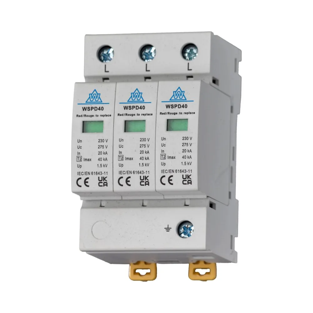 The WCED WSPD340 is a Type 2 3-pole SPD rated at 40kA. It meets 18th Edition standards and protects 3-phase systems in homes, businesses, and industrial setups. Compact, durable, and DIN-rail ready for fast installs.