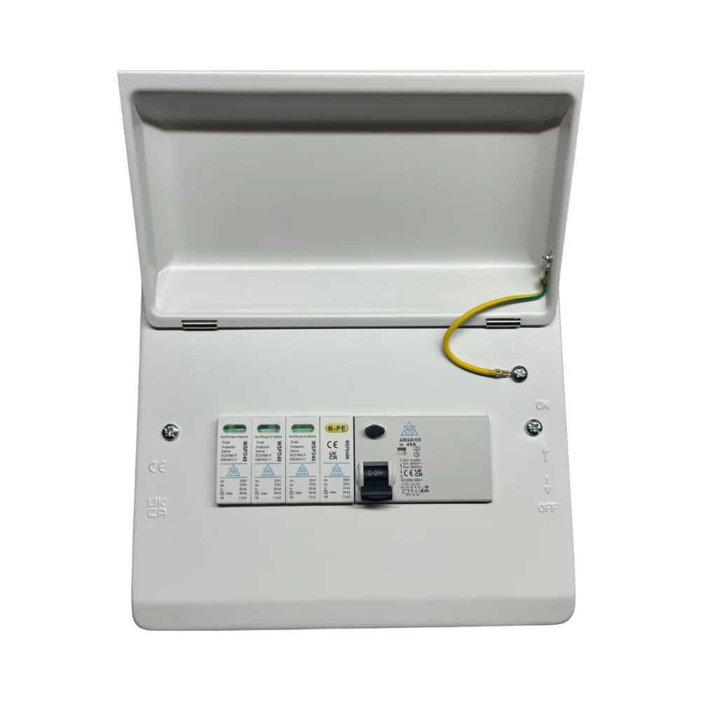 - Integrated Protection – Combines a 4 Pole SPD with a 4 Pole 40A C Curve Type A RCD
